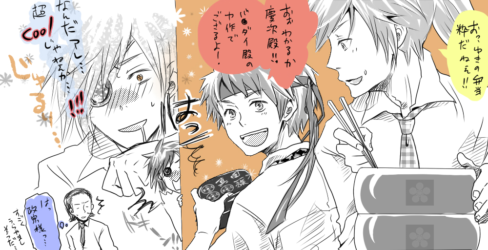 この余裕があるうちに個人誌の原稿をすればいいのに・・・しようとおもって帰宅したのに・・・ バ●ダイ様からイカした弁当箱新発売ニュースが出てて思わず落書きに全身全霊をこめちまったじゃねえかぁああ^p^← 既に出回っているものを何点か見たことありますが、あらためてニュースとかで見るとこう・・・ふぉっときます(笑) いちOLのいちオタクとしては、幸.村弁当は紅一色に金色の六文銭が中央にちまっとあるくらいがいいです。政.宗様はもちろん青地に銀色の家紋でお願いします。誰か作ればいいのに← PR COMMENTSCOMMENT FORM |